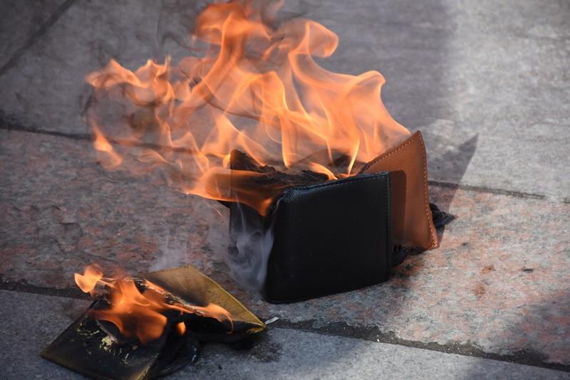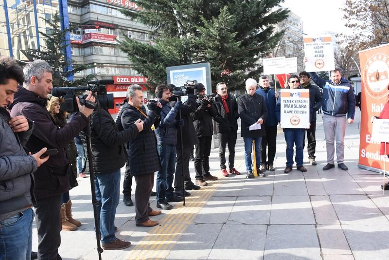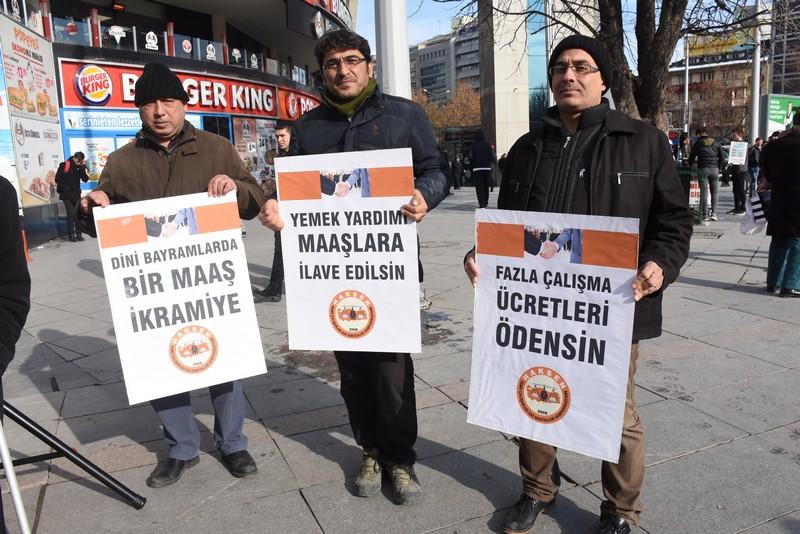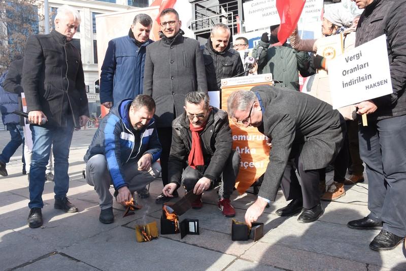 memur ve emeklilerin yoksulluk sınırının altında bir ücretle geçinmek zorunda kaldıklarını, maaşlarının banka hesabına yattıktan kısa bir süre sonra cüzdanların boşaldığını belirterek, boş cüzdanlarını yaktılar